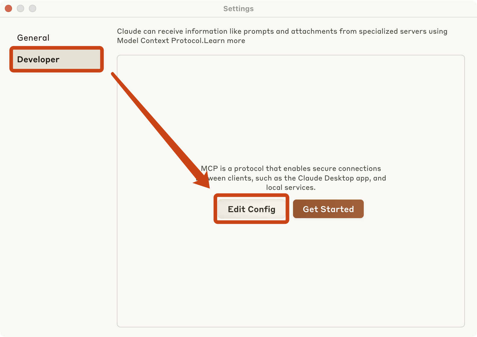 For Claude, you first need to go to the Claude settings page and follow the steps shown in the image below. Then, as prompted, edit Claude's claude_desktop_config.json configuration file and add the following MCP JSON service configuration.
